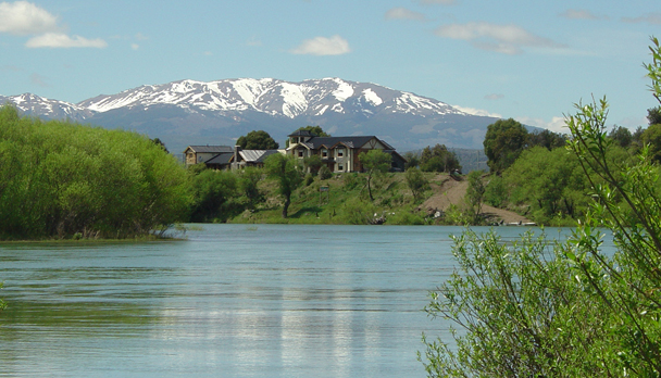 Challhuaquen, which in the local Mapuche language means "fishing place", is located in the Trevelin valley, Province of Chubut, on the bank of the Futaleufu river or Rio Grande, in front of the National Park Los Alerces, heart of the Argentinean Patagonia.
