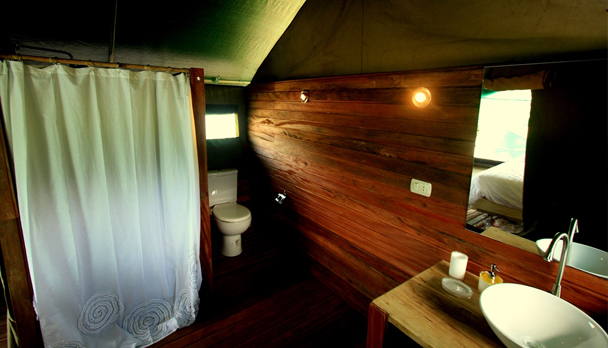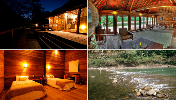 La construcción del lodge es bien tropical, techos de hoja de palmera, paredes de madera, no tiene vidrios, sino grandes puertas y ventanales de mosquitero, todo con cortinas rústicas agradables. Las cabañas son comodas, espaciosas, con baño privado; pero no hay aire acondicionado, cosa que al ser tan ventiladas no se extraña demasiado. Las camas son cómodas, la única critica que le haría a la parte práctica de la arquitectura, es la escasa iluminación, que quizás sea para no atraer demasiados insectos al lugar. La electricidad se interrumpía desde las 11 de la noche hasta las 6 de la mañana. Durante las horas con energia eléctrica, había wifi, lenta, pero al menos permitía mantenerse comunicados a los que así lo deseaban.