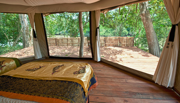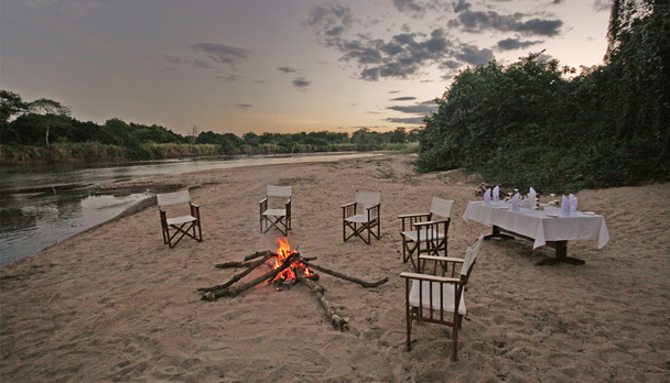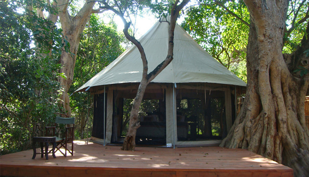 Tengo Camp (río Mnyera): Es el campamento base, con lujosas carpas e instalaciones de muy buen nivel. Consiste en 4 tiendas twin o dobles construidas sobre madera elevada, con deck propio que da al río. La decoración es local con muy buen gusto, en suite y todas poseen una panorámica de 360 grados.