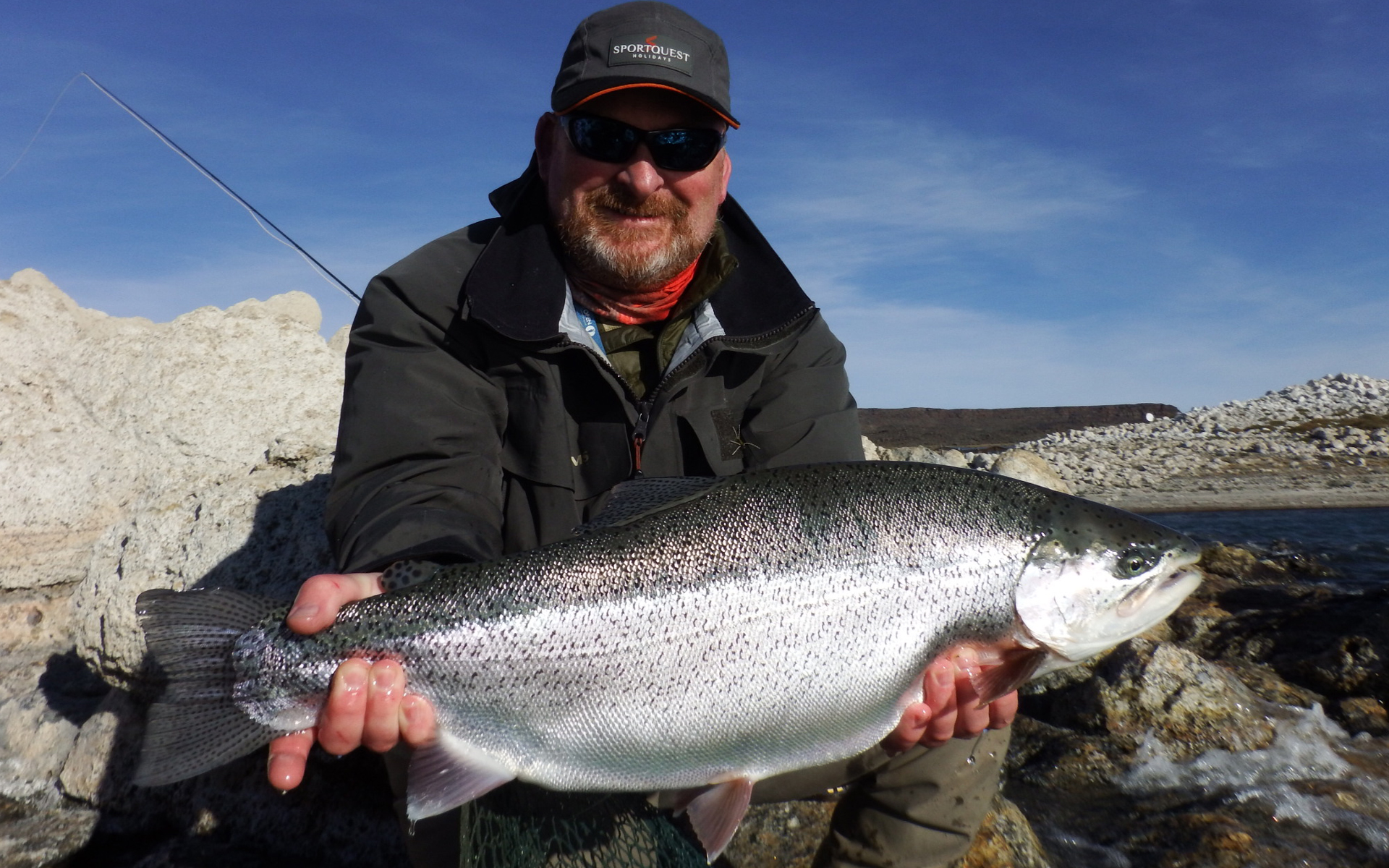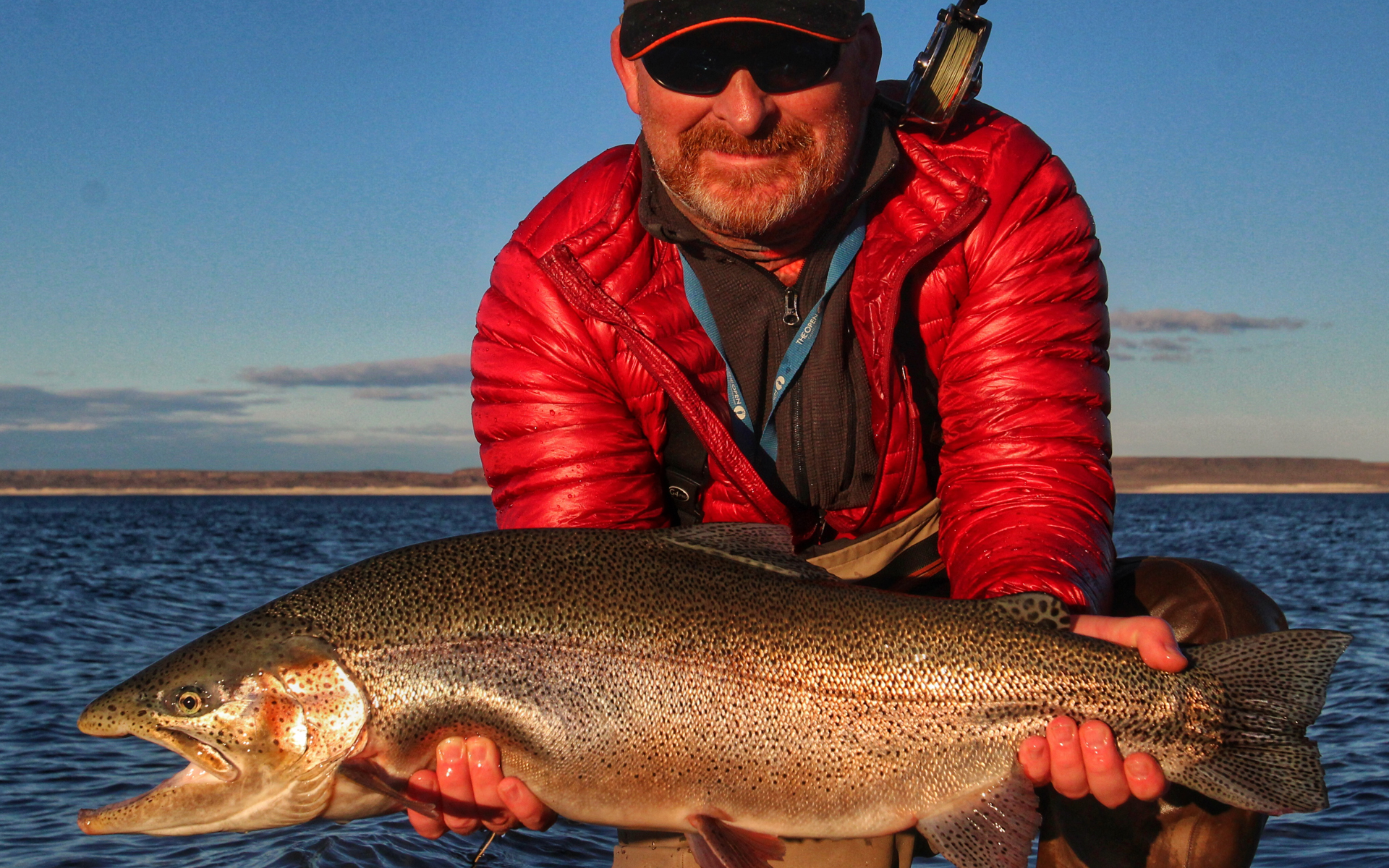 We fished from 9 to 12:30 hrs and from 16 to 16:30 hrs, with double hand rod which resulted the best option to achieve longer distances. It was notorious the difference from those who kept on with one hand rod, they got less hook ups. The most popular flies were nymphs (Prince, Scuds, Copper John, etc…) and some small Wolly Bugger in olive, black and white colors. Floating lines and intermediate in special occasions, with leaders 9 to 12 ft and from 12 to 16 lbs. In very few occasions we could fish with dry flies, foam style, only late in the evening when the wind was calmer and it was really fun because fish (6 to 11 lbs) bit the fly very gently but then gave a nice fight.