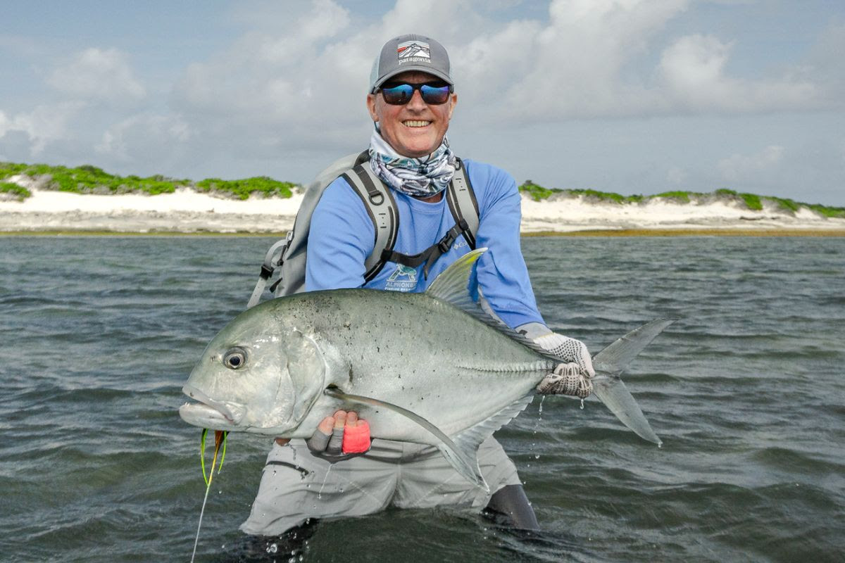 On the second to last day the weather got better and the fish seemed to come onto the flats again, Angus saw an exciting looking fish on a ray and he made a perfect cast and which landed in the right spot, and with one strip and the fight was on and a few minutes later he landed a 88 cm GT!