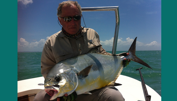 One morning I landed a good Tarpon of about 60 lb. We went to a different site in the afternoon, the guide had warned us earlier on in the week 'sometimes we see Permit there; they feed near the surface of the water showing their tails even though the depth is 3-4 meters'. As we fished I had a good strong take just like a Tarpon [well I did have a black and red Tarpon fly on the end of my line], it ran taking out the backing but it did not jump at all. A strong fish, and as it came closer to the boat the guide was as excited as I to see a good size Permit eventually measured at 87 cms. We raced off to the flats to find a bonefish for the grand slam!